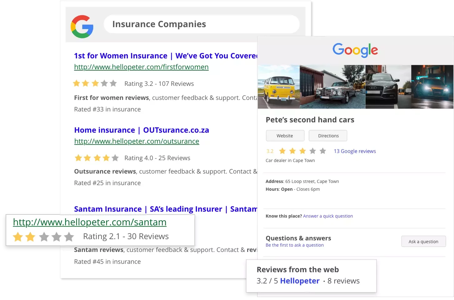 Enhance your business's online presence and reputation by proudly showcasing reviews and ratings from multiple platforms. With Hellopeter, you'll gain access to customisable widgets that are fully optimised, maximising your business's visibility on Google and boosting your rating.